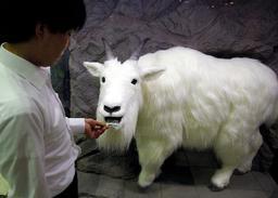 体長約1.6メートルで真っ白な毛並みだが、実はロボット。ロッキー山脈などに生息するシロイワヤギを忠実に再現した。舟券を口にあてがうとセンサーが感知する。